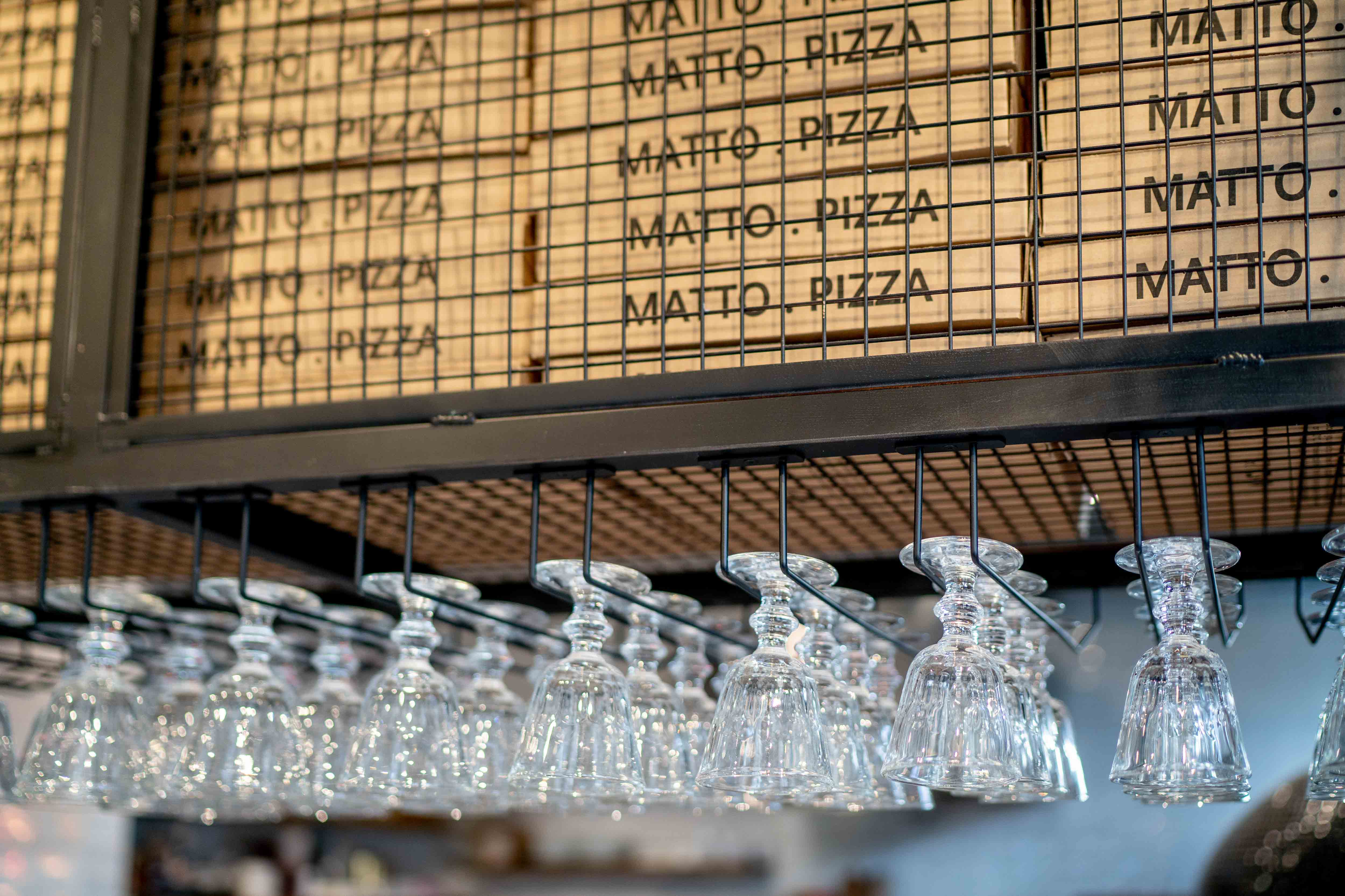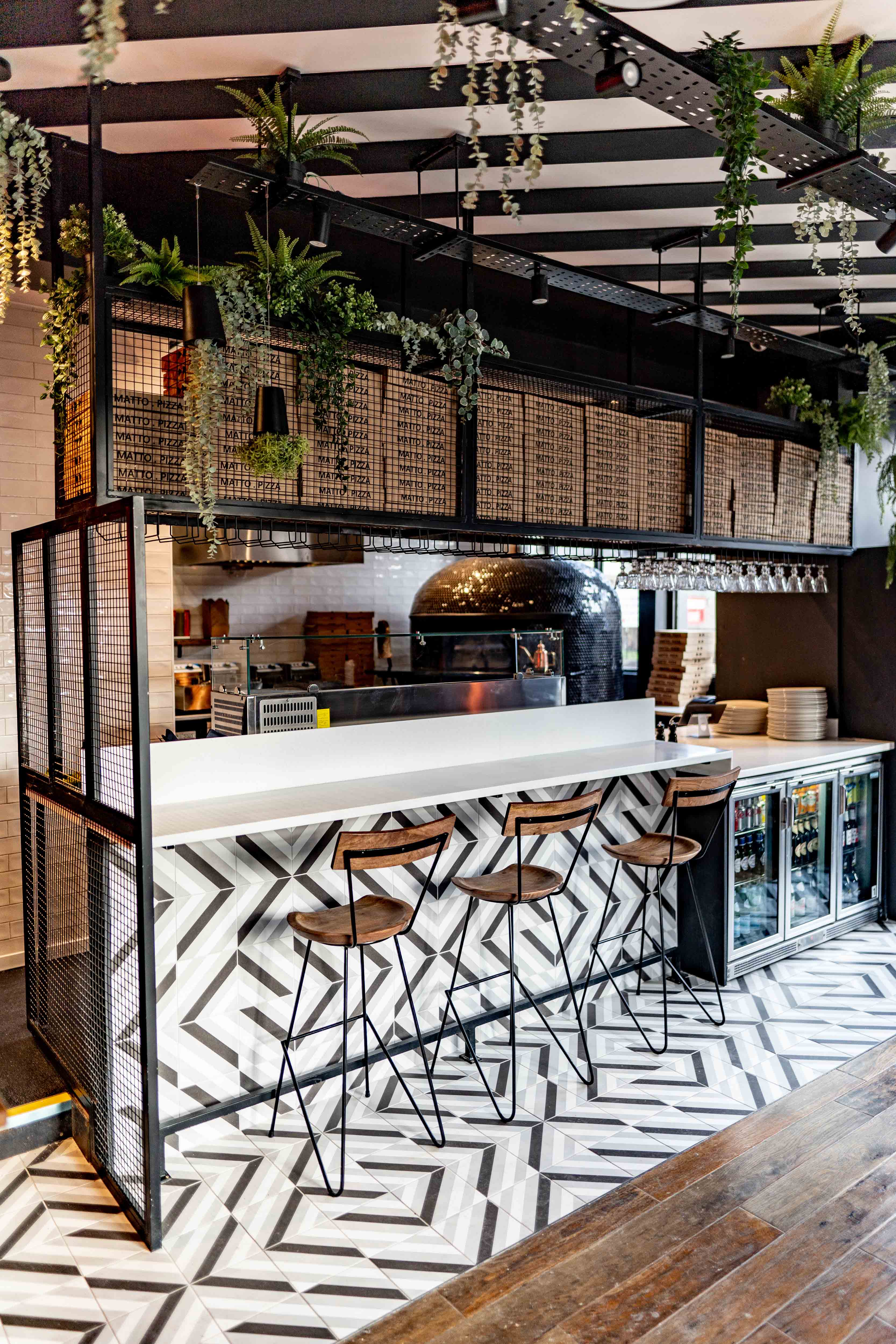 The creative concept was born from the translation of 'Matto' meaning 'Crazy' in Italian. A beautiful traditional listed building we wanted to honour the architectural details while ensuring that Matto's brand values were felt by guests. The bold and boisterous nature of the Neapolitan culture was translated into a striped ceiling inspired by original Neapolitan tiles with an original ceiling rose popping in bright pink to offset the more traditional exposed brickwork. Timber accents in furniture choices inspired by the show stopping wood fired pizza oven dressed in black gloss mosaic tiles reminiscent of a huge disco ball to set the atmosphere.
